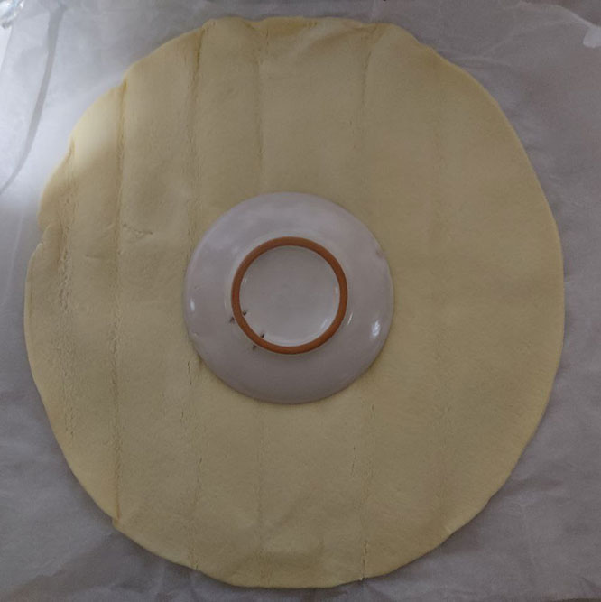Retire a massa folhada da geladeira 10 minutos antes de usá-la e coloque-a sobre uma superfície de trabalho, posicione no centro um pires ou uma forma de biscoito de 10 cm.