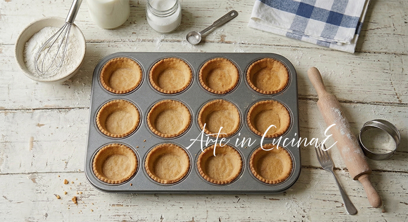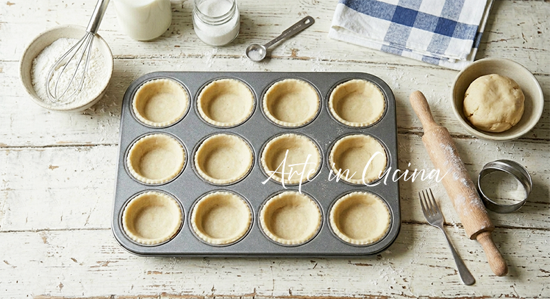 • Abra a massa com cerca de 2,5–3 mm, forre as forminhas de 5–7 cm e fure o fundo com um garfo.